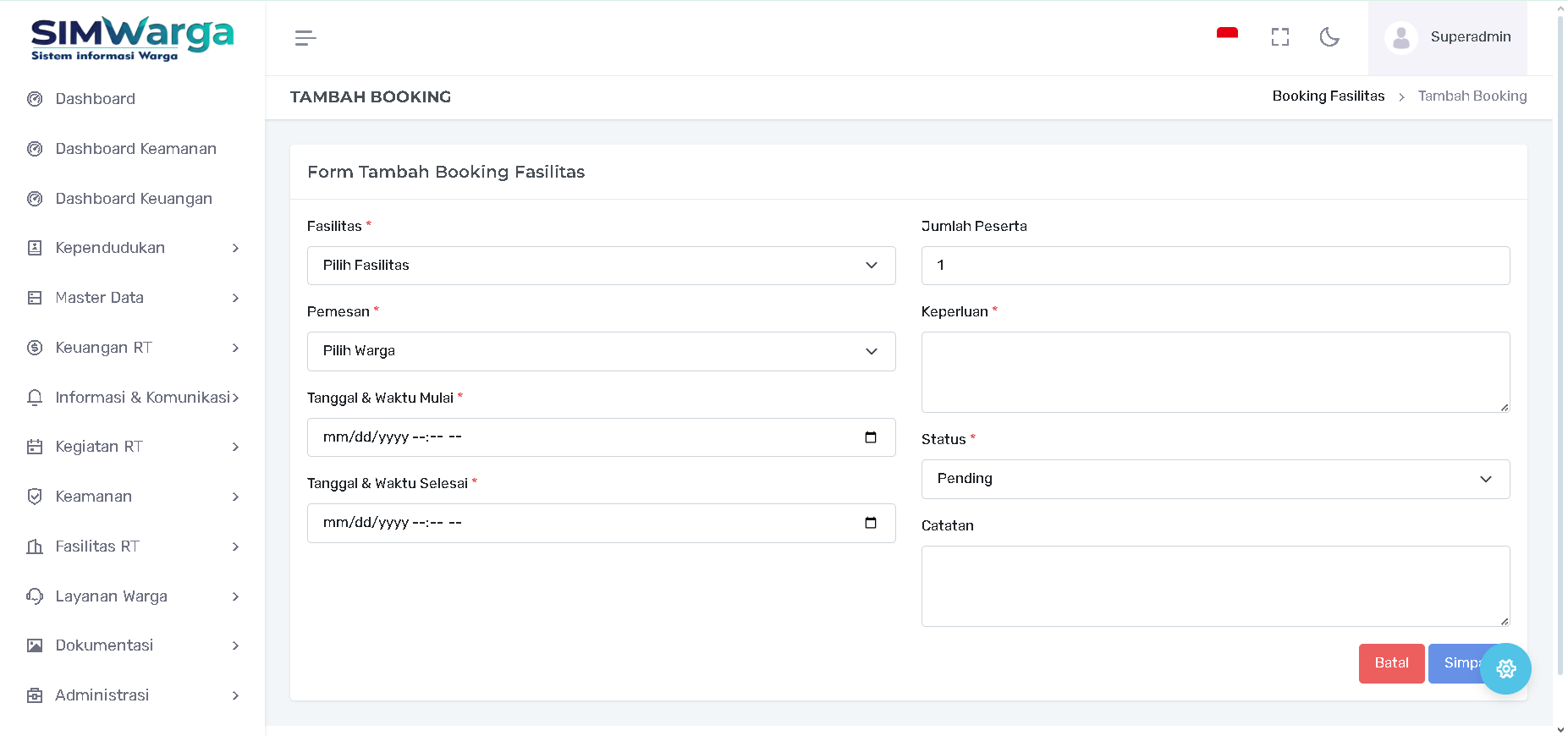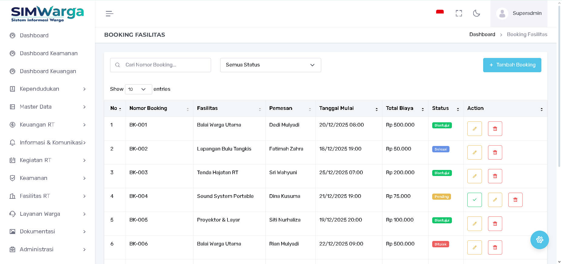 Halaman Booking Fasilitas digunakan untuk mencatat dan memverifikasi setiap permohonan peminjaman fasilitas publik oleh warga. Modul ini memastikan tidak ada jadwal pemakaian yang tumpang tindih serta memantau status pembayaran sewa fasilitas secara transparan.