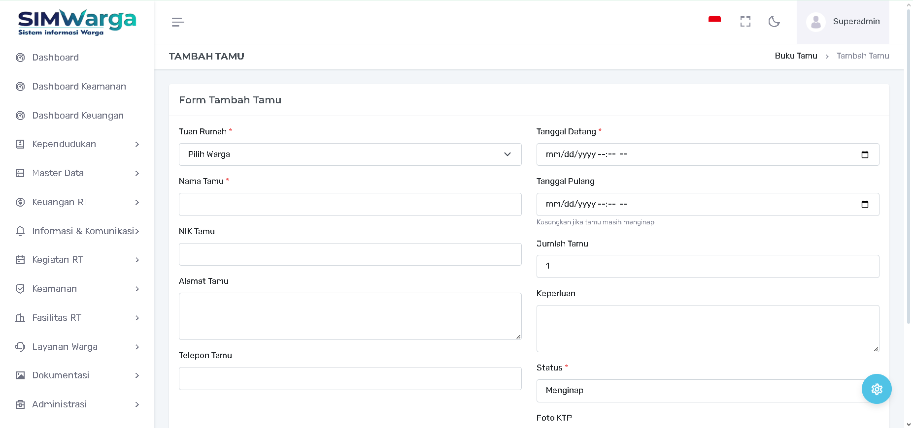 Selalu pastikan foto KTP tamu terunggah dengan jelas dalam sistem. Data ini sangat berharga bagi pengurus jika sewaktu-waktu pihak kepolisian atau instansi terkait memerlukan riwayat data pendatang di lingkungan tersebut.