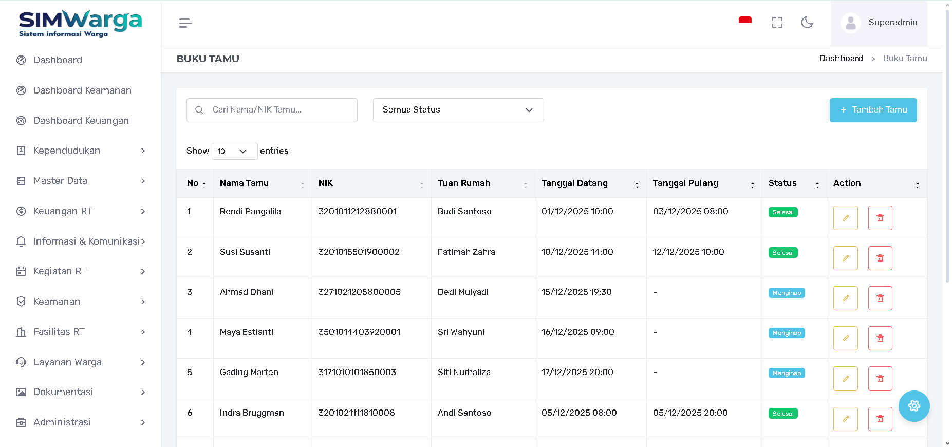 HalamanĀ Buku Tamu adalah instrumen pengawasan administratif untuk mencatat setiap warga luar yang berkunjung atau menginap di lingkungan RT/RW. Fitur ini sangat krusial untuk menjaga ketertiban, keamanan, dan tertib administrasi kependudukan sementara.