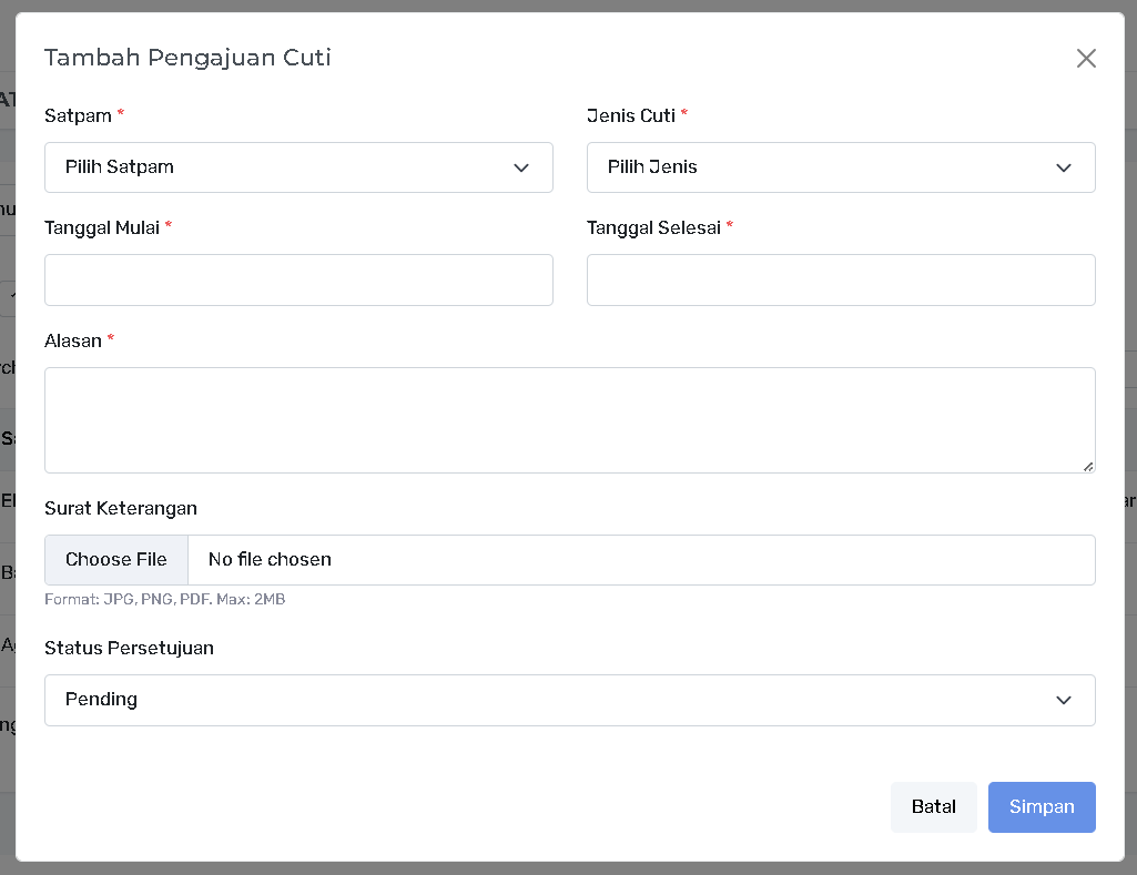 HalamanĀ Cuti Satpam digunakan untuk mencatat, meninjau, dan memvalidasi permohonan izin kerja dari petugas satpam. Dengan adanya sistem ini, pengurus dapat memastikan kekuatan personel tetap terjaga sebelum memberikan persetujuan izin.
