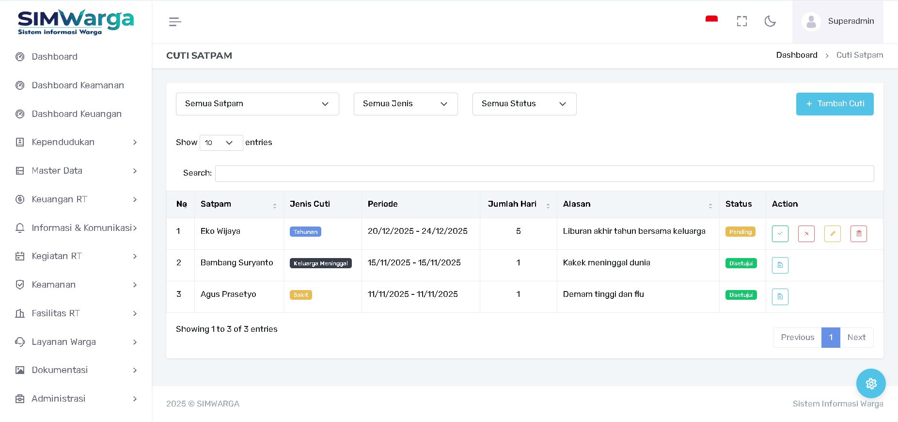Sebelum menyetujui status Disetujui, sangat disarankan untuk memeriksa Jadwal Satpam terlebih dahulu guna memastikan bahwa tugas petugas yang cuti sudah dialihkan ke personel lain agar keamanan lingkungan tetap terjamin.