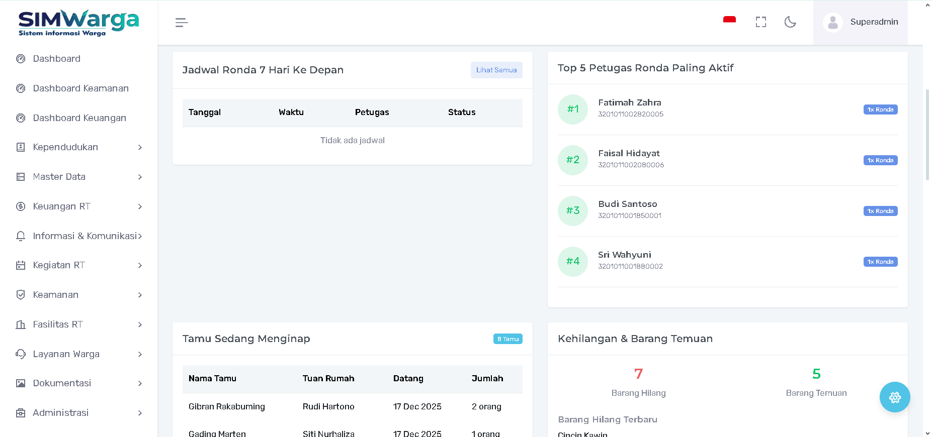Kehilangan & Barang Temuan: Fitur "Lost and Found" yang merangkum jumlah barang hilang dan barang yang ditemukan oleh warga. Dilengkapi juga dengan daftar "Barang Hilang Terbaru" beserta nama pemilik dan tanggal kejadian.