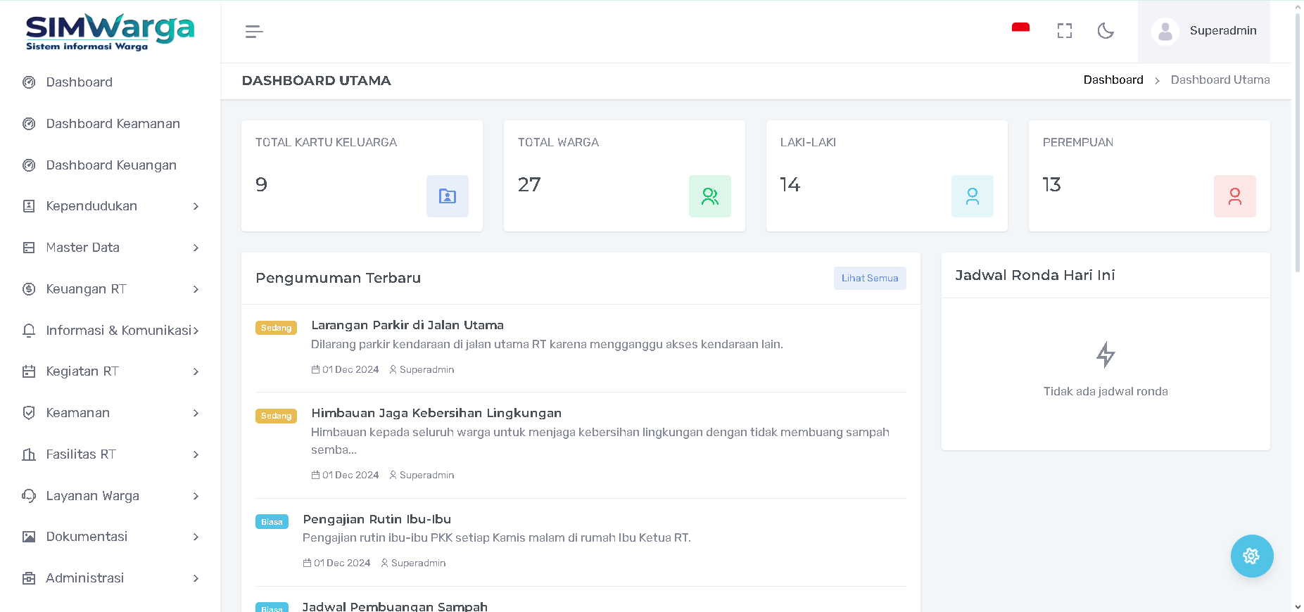 Halaman Dashboard Utama adalah pusat informasi ringkas yang memberikan gambaran menyeluruh mengenai kondisi lingkungan RT/RW secara real-time. Halaman ini dirancang untuk memudahkan pengurus (Superadmin) memantau data warga, pengumuman, hingga ekonomi lokal.