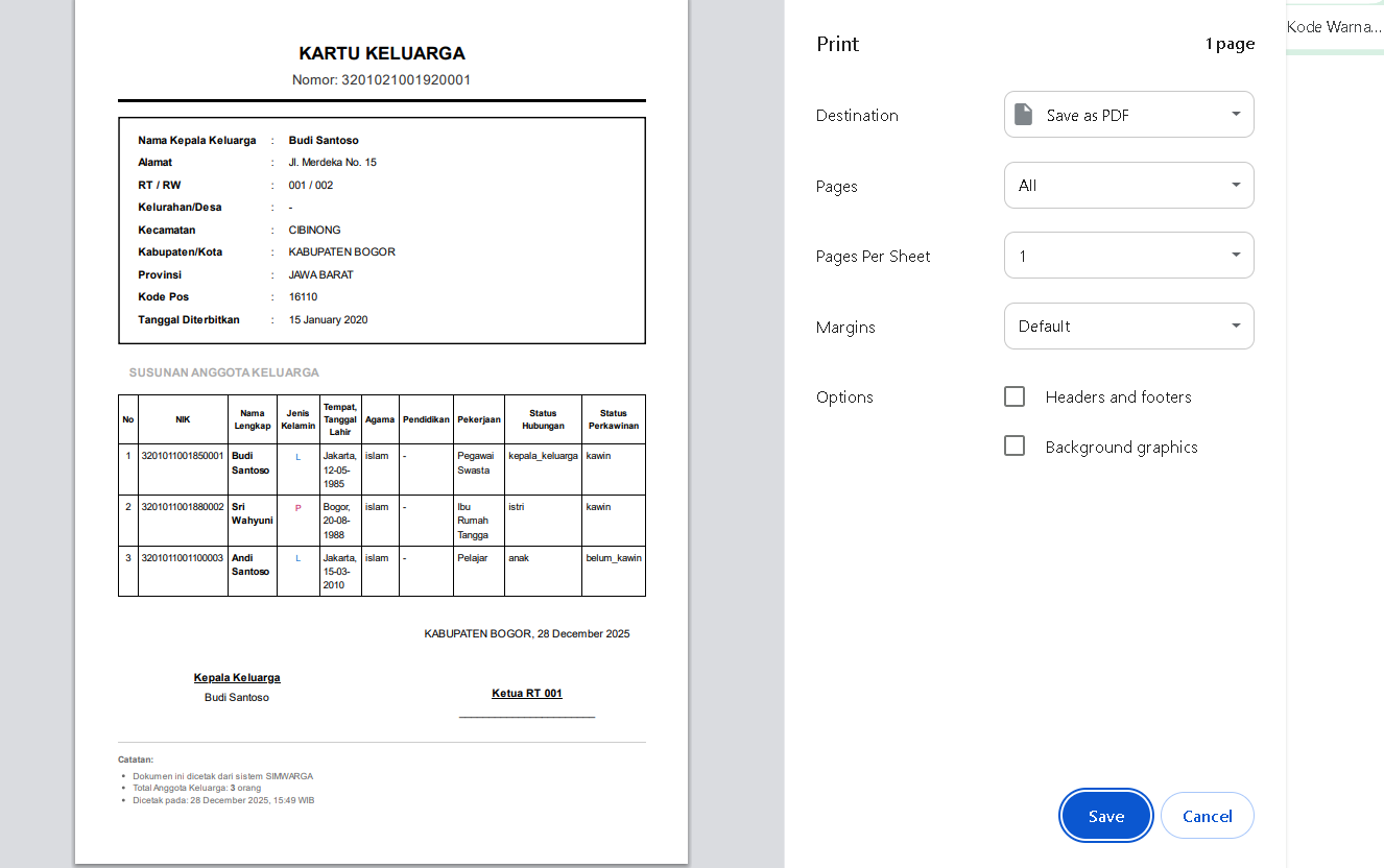 Informasi Kartu Keluarga: Bagian atas menampilkan ringkasan KK warga tersebut, termasuk Nomor KK dan Alamat lengkap.