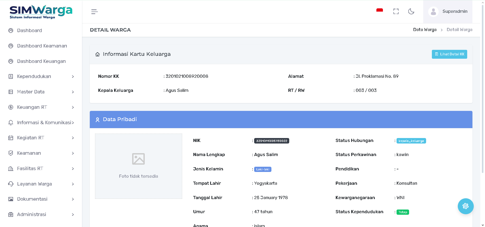 Pada kolom Action, terdapat tombol Detail (ikon mata biru). Ketika diklik, sistem akan mengarahkan Anda ke halaman Data Pribadi warga yang sangat mendalam:
