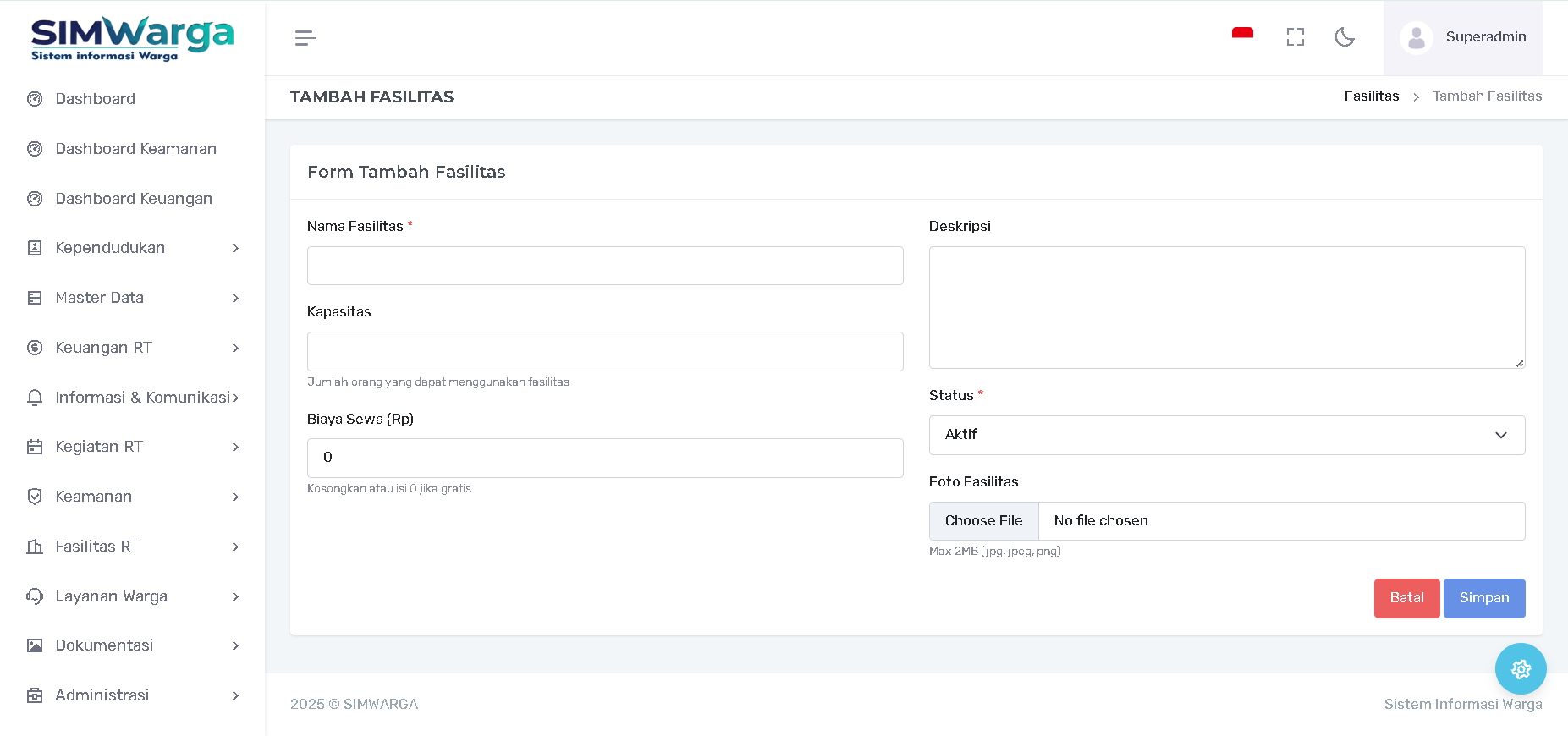Foto Fasilitas: Unggah gambar aset (maksimal 2MB) untuk memberikan gambaran visual kepada warga.