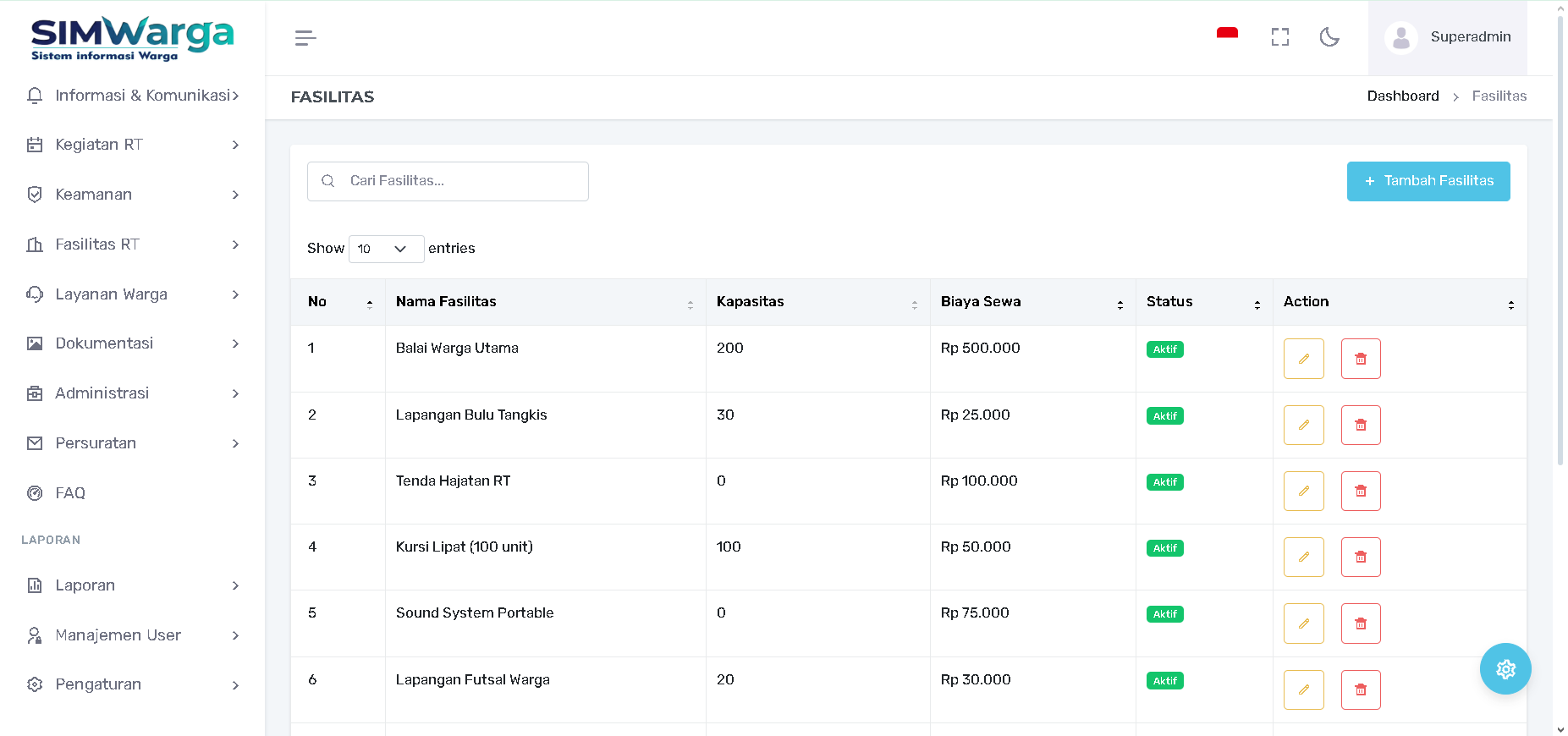 Biaya Sewa: Nominal rupiah yang ditetapkan untuk peminjaman fasilitas. Jika biaya bernilai Rp 0, maka fasilitas tersebut dapat digunakan warga secara gratis.