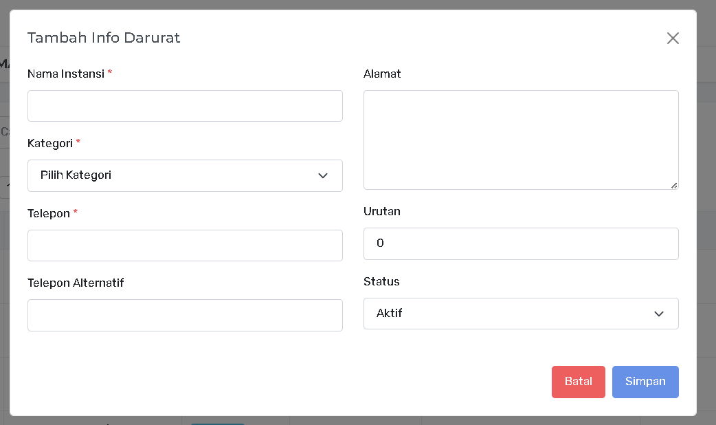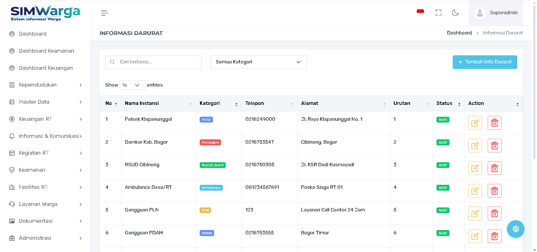 Halaman Informasi Darurat adalah modul krusial yang digunakan untuk menyimpan nomor telepon instansi penting. Data yang dikelola di sini akan muncul secara otomatis pada Dashboard Keamanan warga, sehingga memudahkan mereka menghubungi bantuan saat terjadi kondisi mendesak.