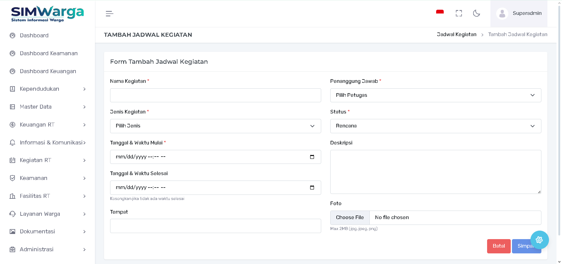 Halaman Jadwal Kegiatan adalah kalender kerja operasional lingkungan yang mencatat seluruh agenda, mulai dari kerja bakti, rapat warga, hingga peringatan hari besar. Fitur ini memastikan seluruh warga dan pengurus memiliki referensi waktu dan lokasi kegiatan yang sama.