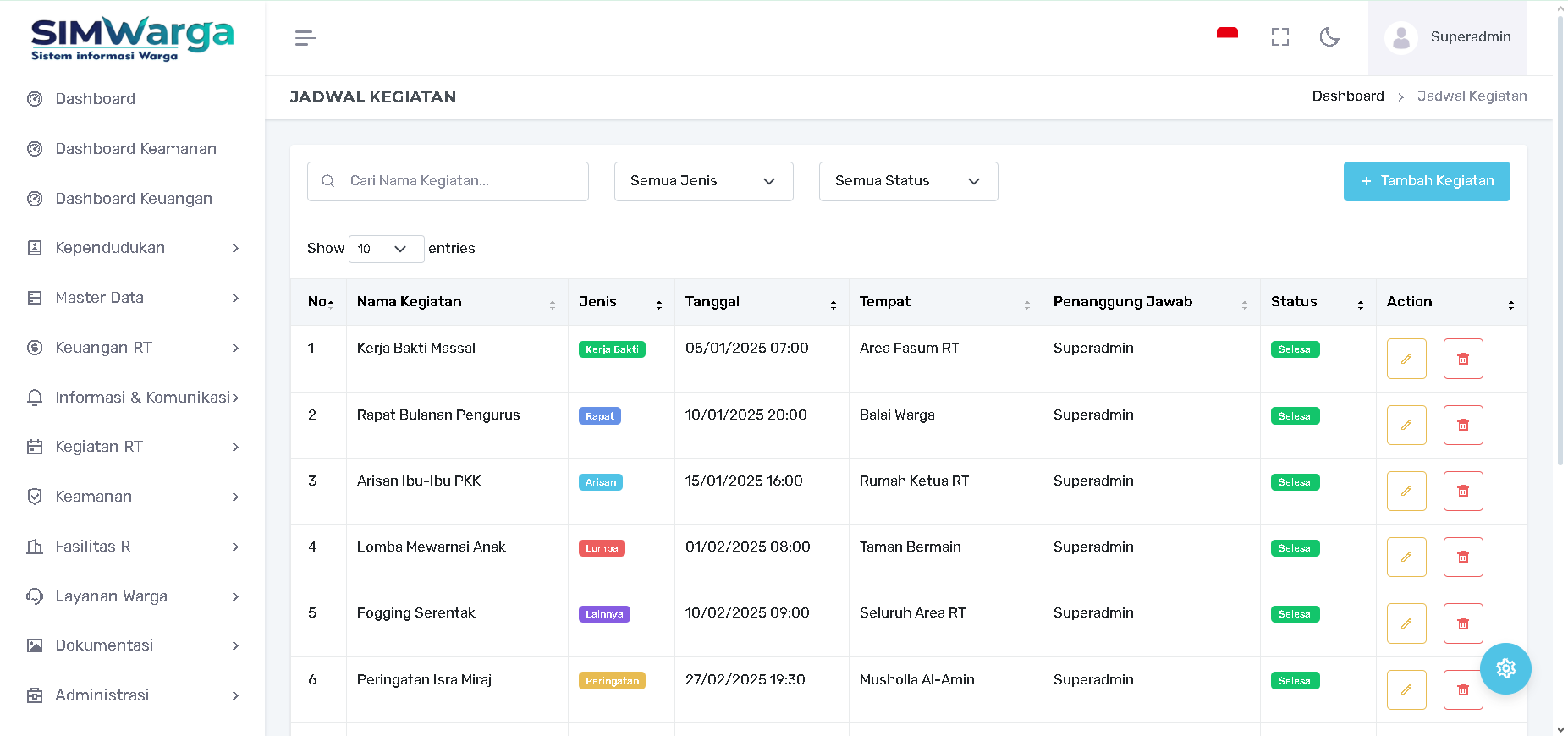 Jenis: Klasifikasi kegiatan menggunakan label warna untuk pembedaan visual (Kerja Bakti, Rapat, Arisan, Lomba, dll.).