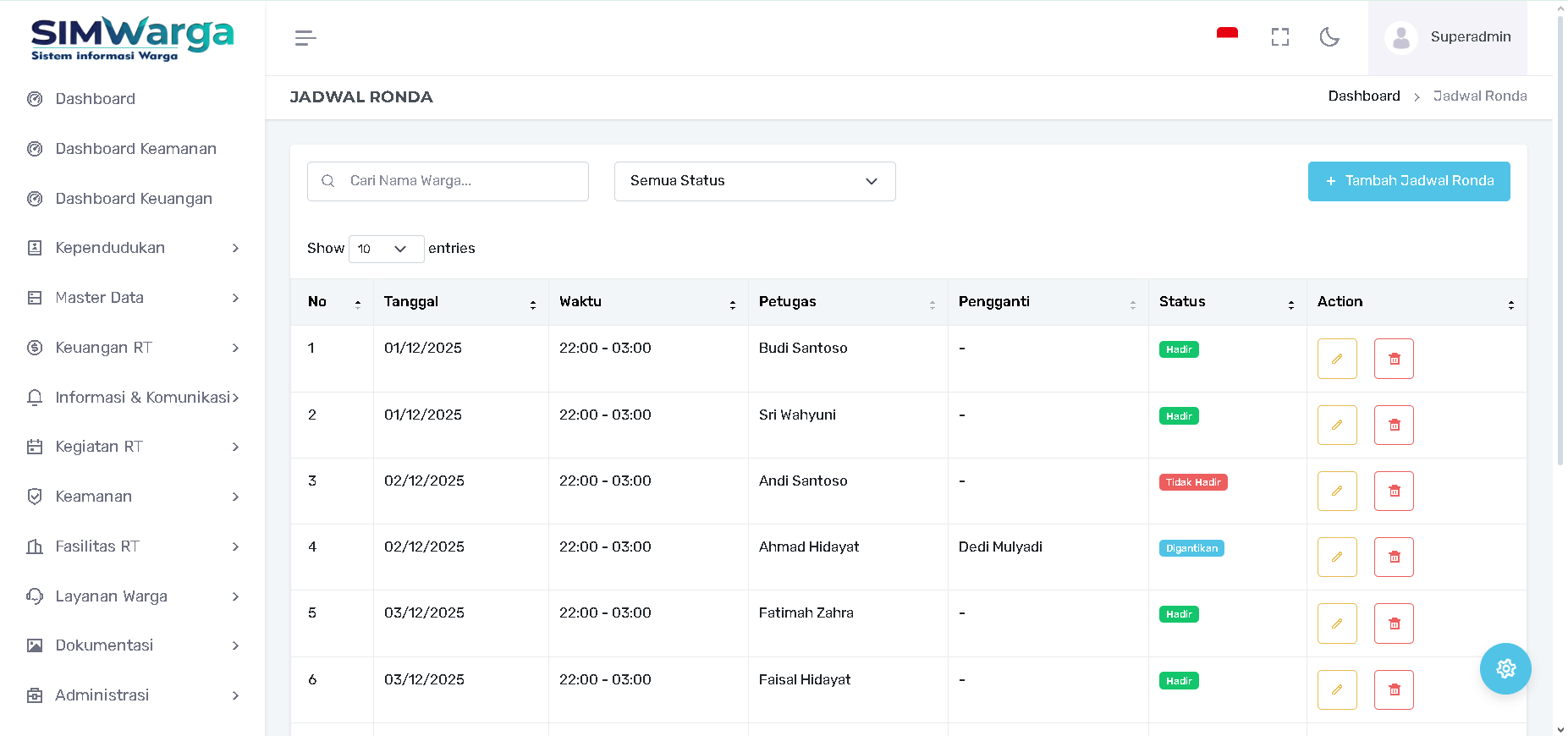 Ubah (Ikon Pensil): Digunakan untuk mencatat kehadiran warga setelah tugas selesai atau mengubah petugas jika ada pertukaran jadwal.