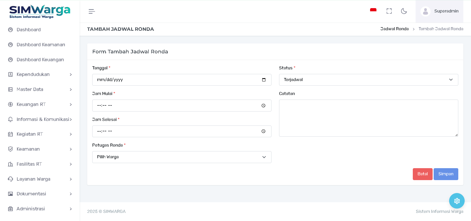 Pengurus dapat menginput pembagian tugas ronda melalui tombol "+ Tambah Jadwal Ronda". Formulir yang perlu diisi meliputi: