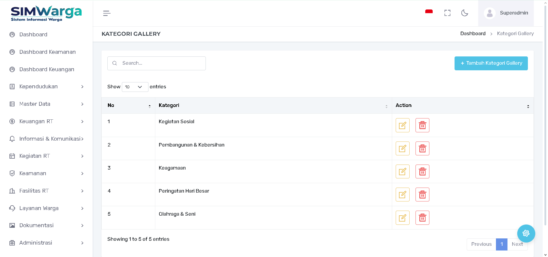 Halaman Kategori Gallery digunakan untuk mengelompokkan dokumentasi foto agar warga dapat dengan mudah mencari arsip kegiatan berdasarkan jenis acaranya. Pengaturan kategori yang rapi akan membuat tampilan galeri di aplikasi warga lebih terstruktur.
