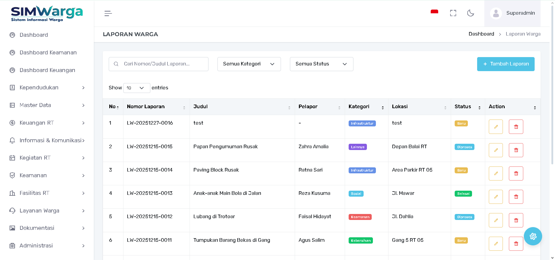 Halaman Laporan Warga adalah media komunikasi dua arah yang memungkinkan warga melaporkan berbagai kendala di lingkungan, mulai dari kerusakan infrastruktur hingga masalah keamanan. Modul ini membantu pengurus RT/RW merespons keluhan secara terstruktur dan transparan.
