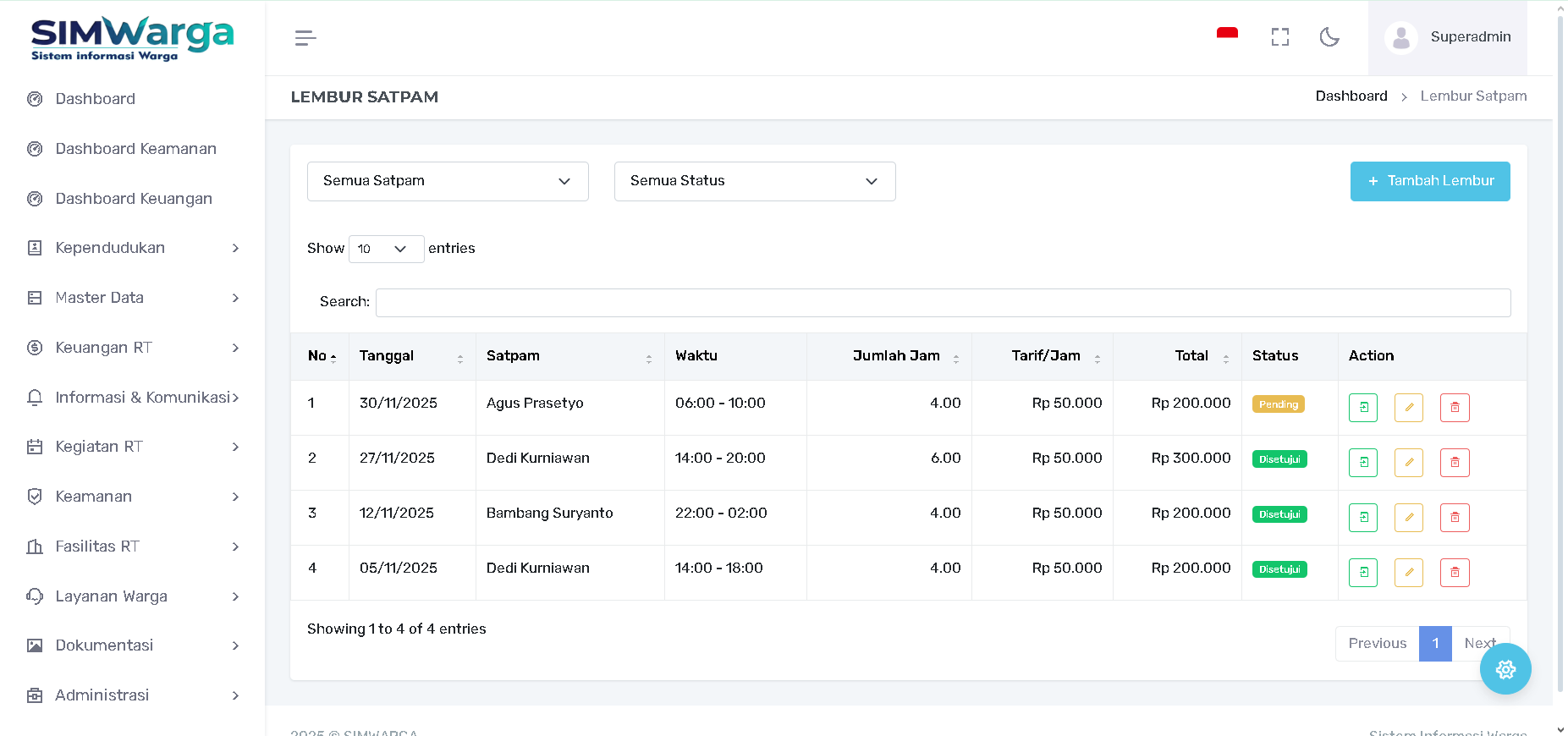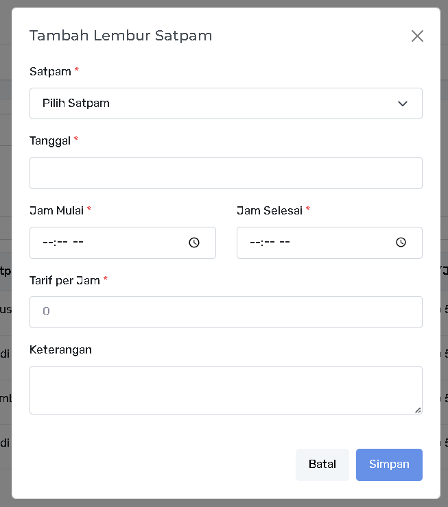 Halaman Lembur Satpam digunakan untuk mendokumentasikan setiap jam kerja tambahan yang dilakukan oleh petugas di luar jadwal shift reguler mereka. Data yang diinput di sini akan terintegrasi langsung dengan komponen bonus pada sistem penggajian satpam.