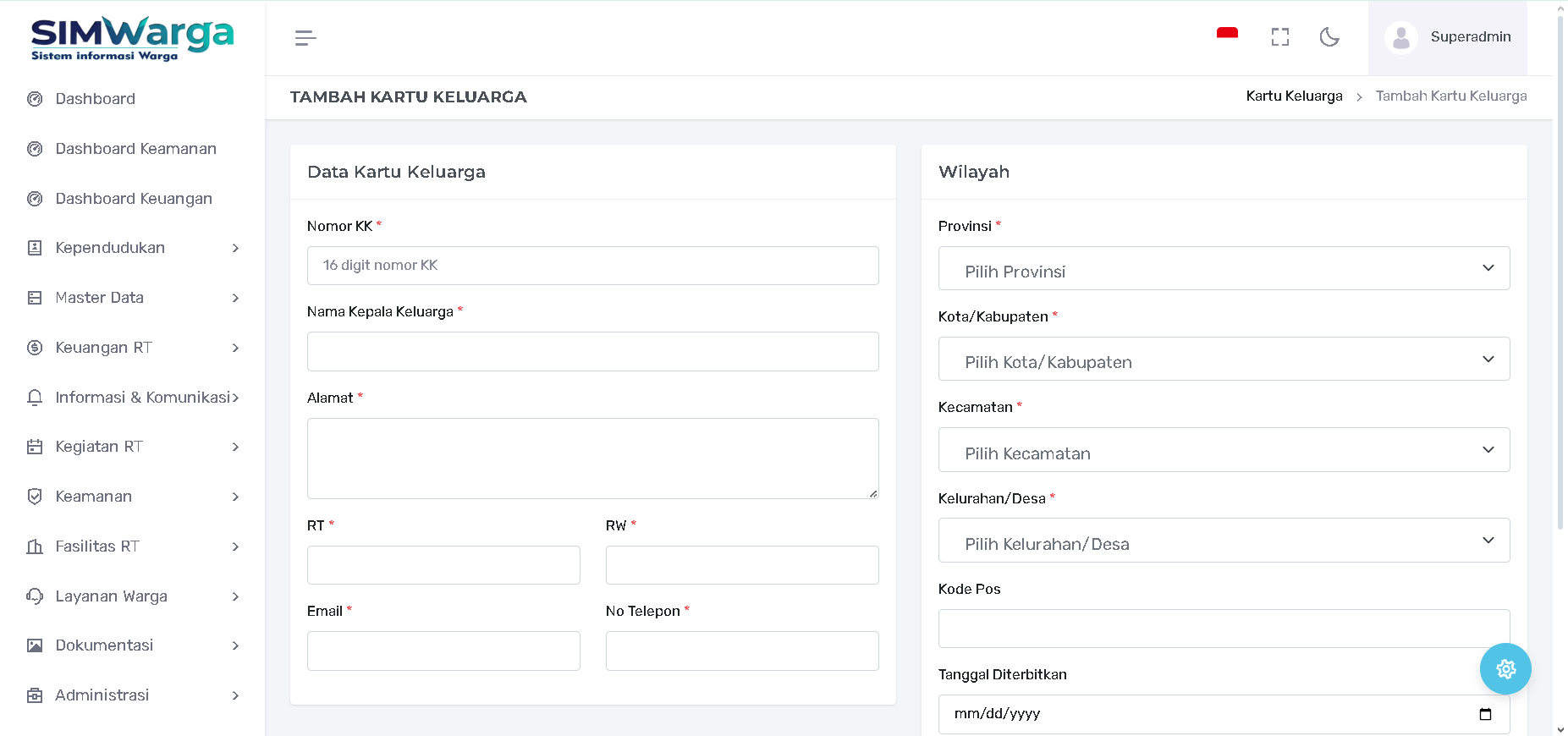 Tanggal Diterbitkan: Pilih tanggal penerbitan kartu keluarga melalui date picker.