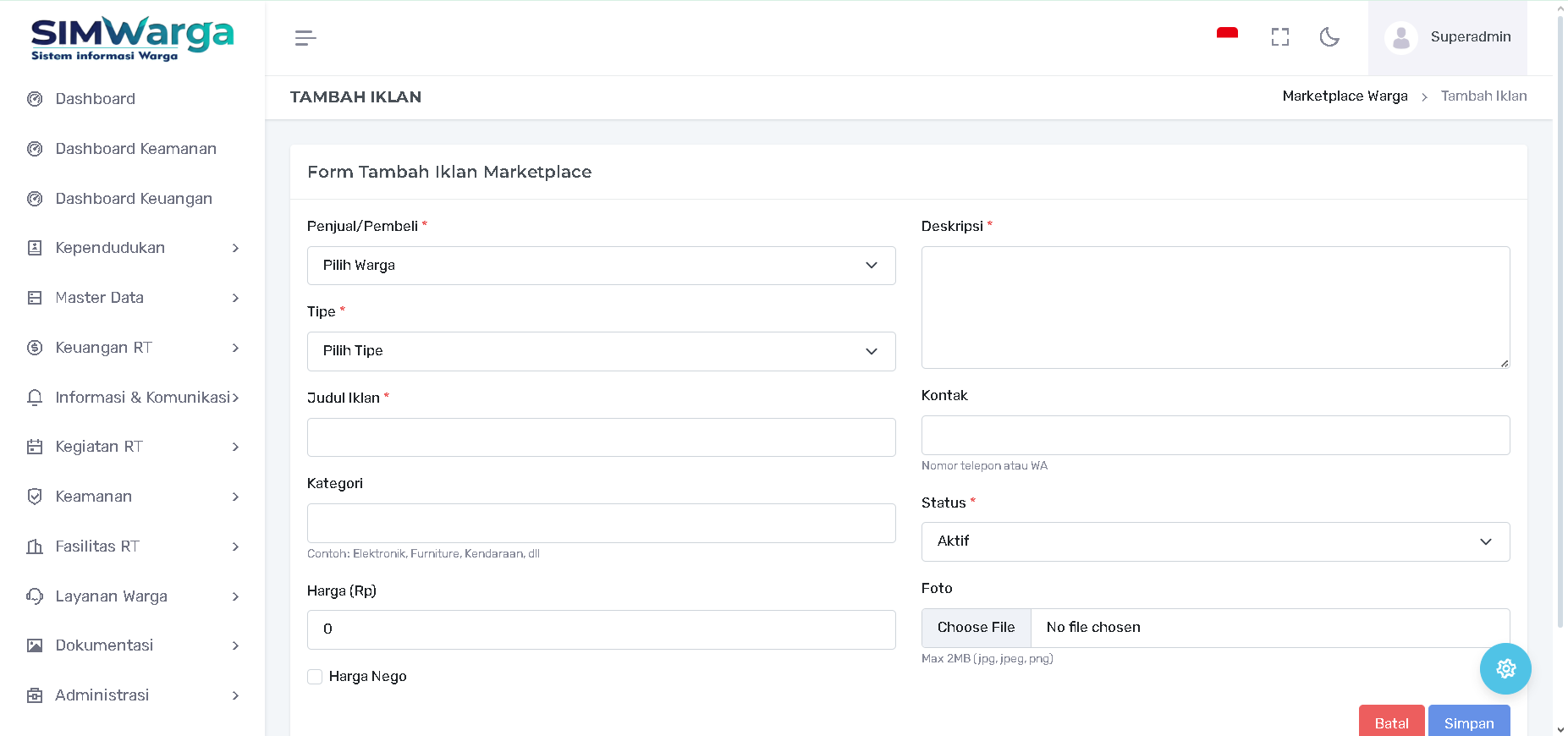 Pengurus atau warga dapat menginput data penawaran melalui tombol "+ Tambah Iklan". Formulir pendaftaran meliputi: