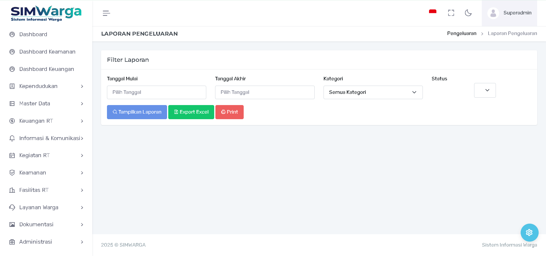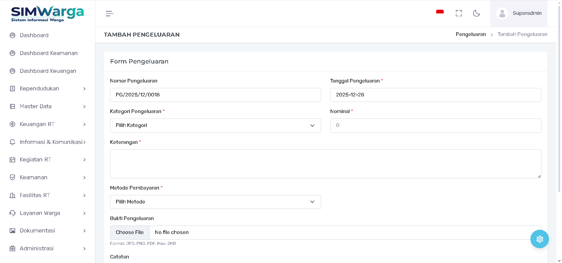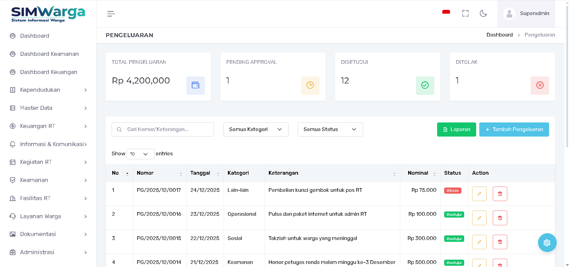 Setiap data pengeluaran yang diinput dengan status Disetujui akan secara otomatis memengaruhi angka Saldo Bulan Ini yang tampil pada Dashboard Keuangan. Pastikan bukti fisik (nota) selalu diunggah untuk menjaga transparansi kepada warga.