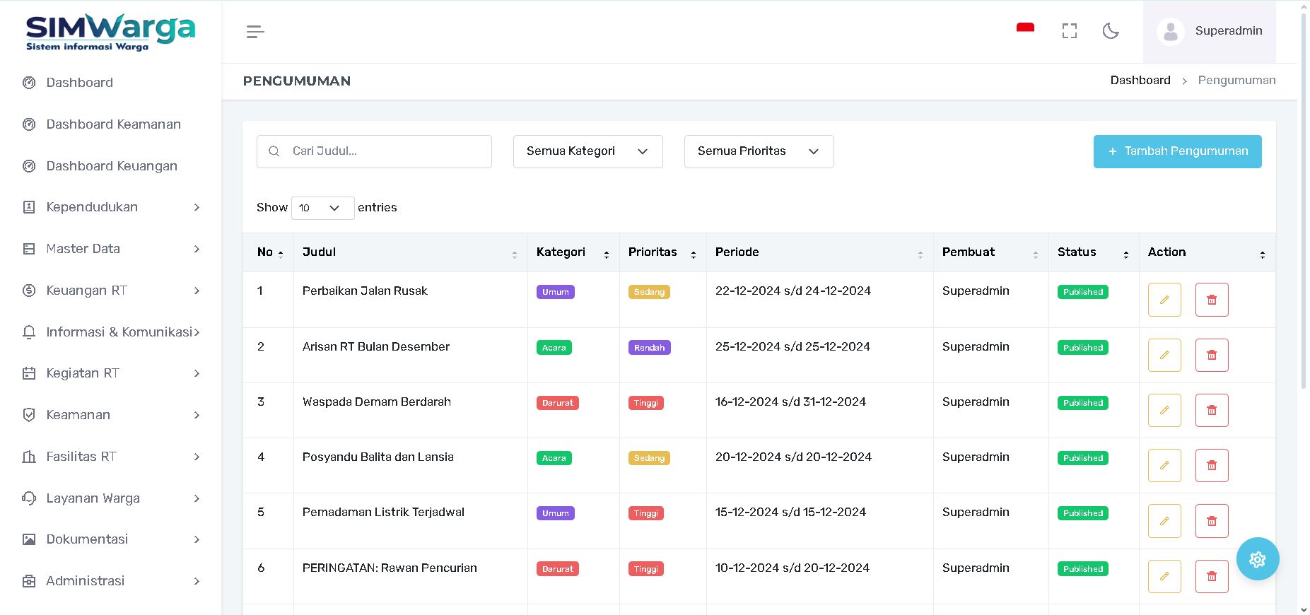 Halaman Pengumuman adalah pusat manajemen berita dan informasi di lingkungan warga. Melalui fitur ini, pengurus dapat mempublikasikan agenda kegiatan, himbauan keamanan, hingga pemberitahuan darurat yang akan tampil langsung di dashboard warga.