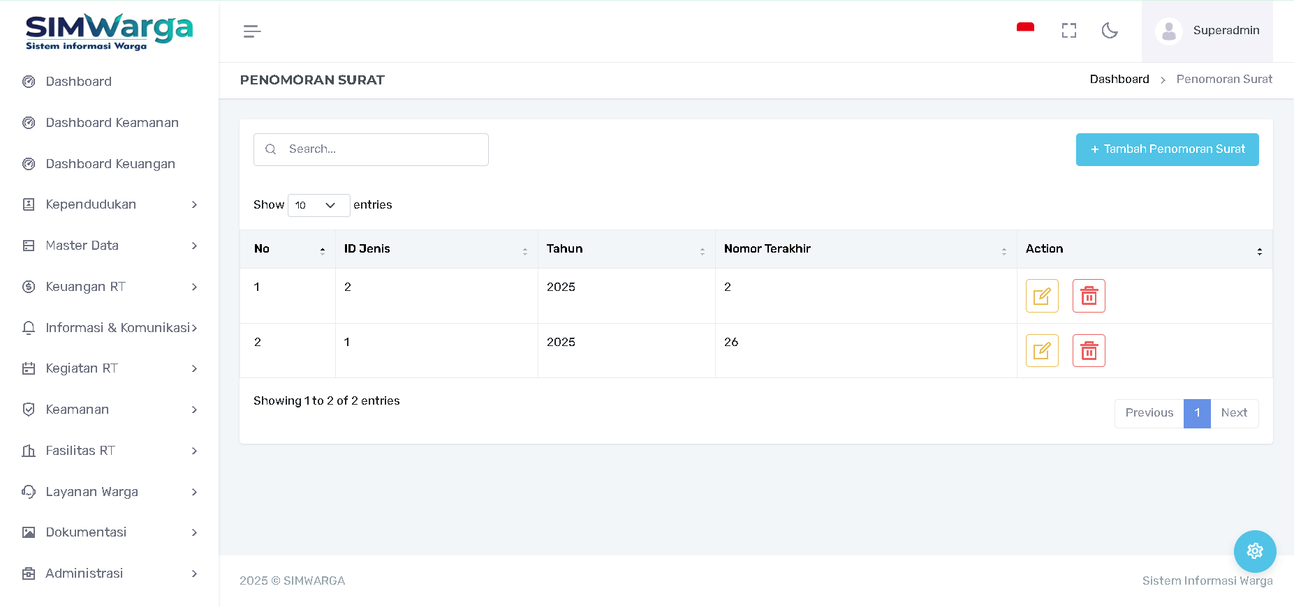 Action: Tombol Edit dan Delete untuk mengelola data setting penomoran.